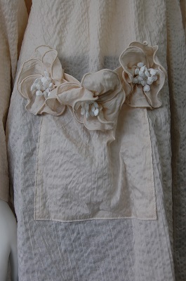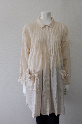 前身にピンタックをあしらい共生地のお花がポケットについたとてもフェミニンな商品です。